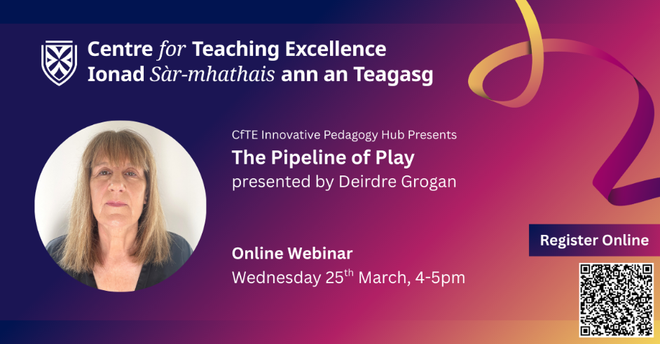 The Strathclyde Hub (Innovative Pedagogy) is delighted to invite you to attend a webinar with Deirdre Grogan. Deirdre’s ‘Pipeline of Play’ presentation outlines the key elements of a play-based environment, through the lens of child-centred practice. The flowchart spans a series of 12 chapters – from system to source, from scale to significance – providing a scaffold for exploring play pedagogy that’s relevant from Early to Second Level, and even beyond.